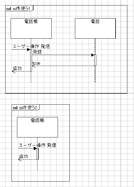 名前sd:sequence diagram概要sd(名前,インデント){ ・・・ }; 名前(文字列):sdの表示名 上記の書式にて記載 説明sd(sequence diagram)を使う。 例: sd("sdを使う1")//★1つ目のSD